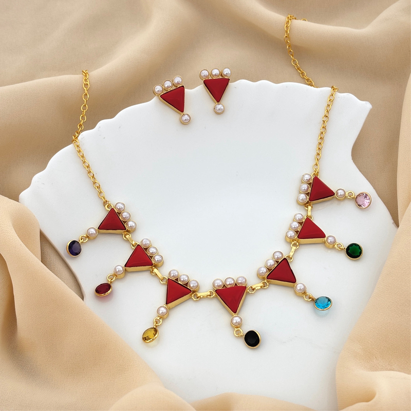 7 Collet Triangle Coral With S Pearl Necklace Sets