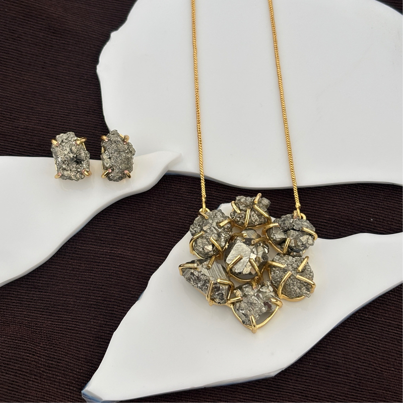 7 Collet Rough Pyrite Pendant With Studs(Claw Type 3 Pc Set)